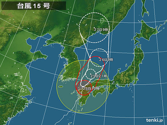気象庁によると、台風15号は25日9時に下関付近を1時間に45キロの早さで北北東に進行。中心気圧は960ヘクトパスカル、中心付近の最大風速は40メートル、最大瞬間風速は55メートルと観測されていた。