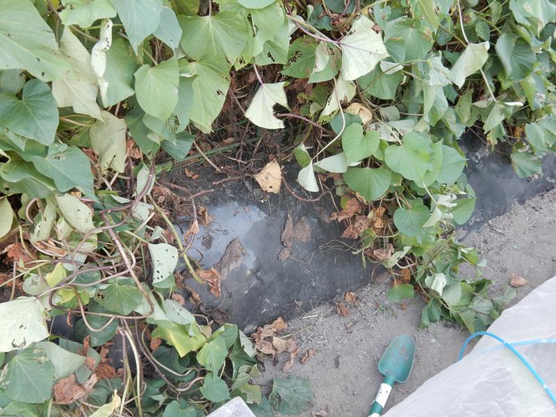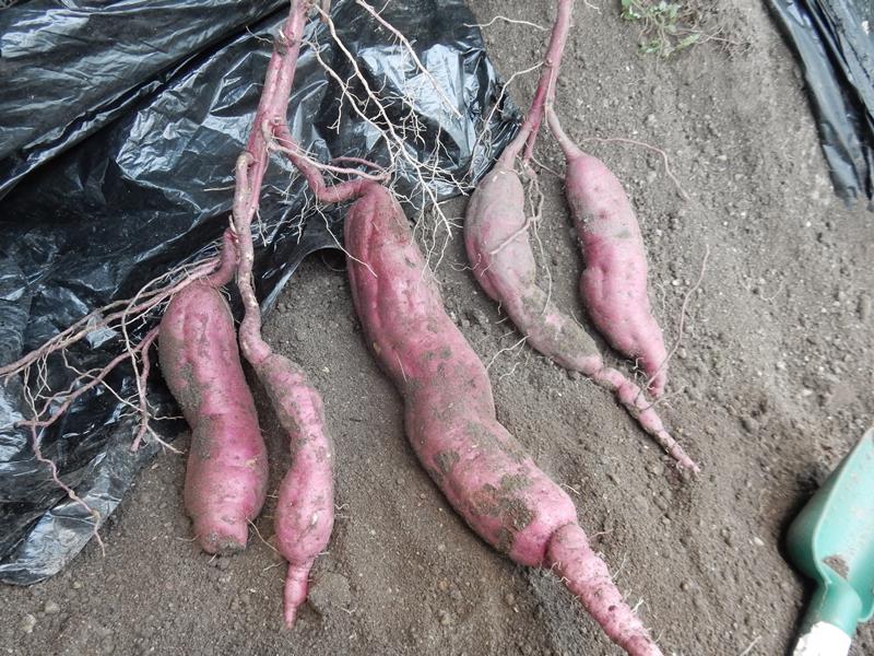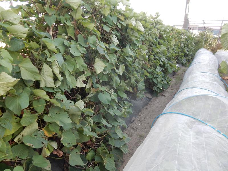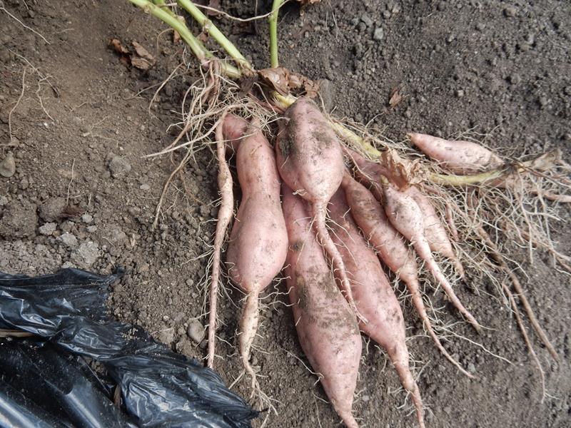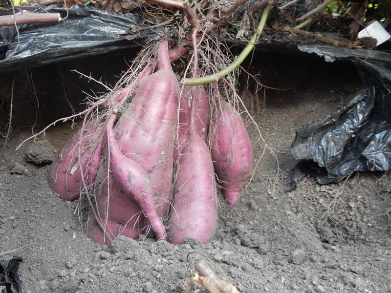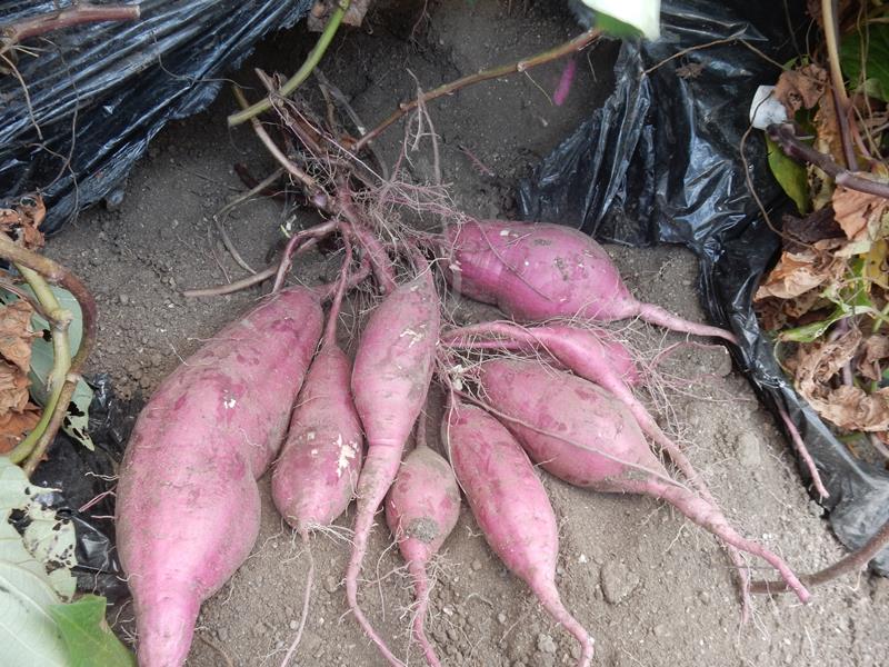 夕方、サツマイモの出来栄えをチェックする