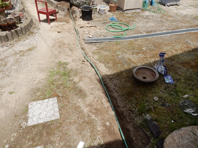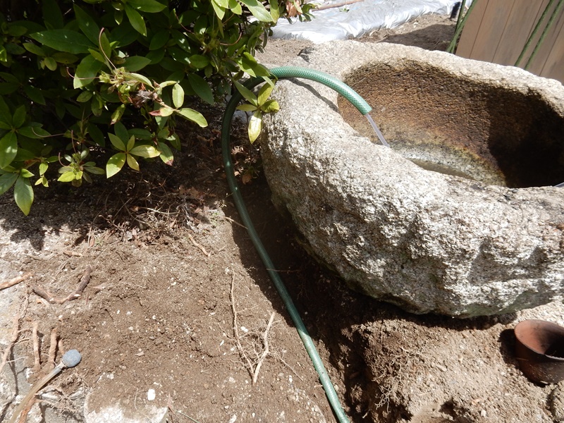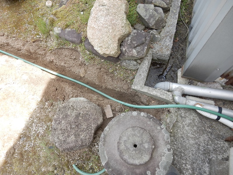 石臼から溝を掘って古くなった水道ホースを入れてその中に