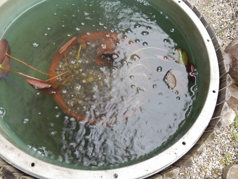 こっちは睡蓮鉢 ここにもメダカがいるので空気を入れてます。