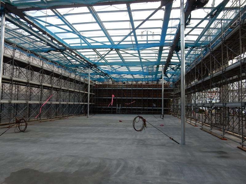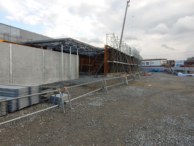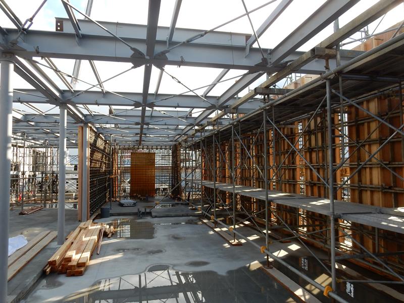 事務所棟は屋根の鉄骨工事が終了し、壁の型枠工事中です。