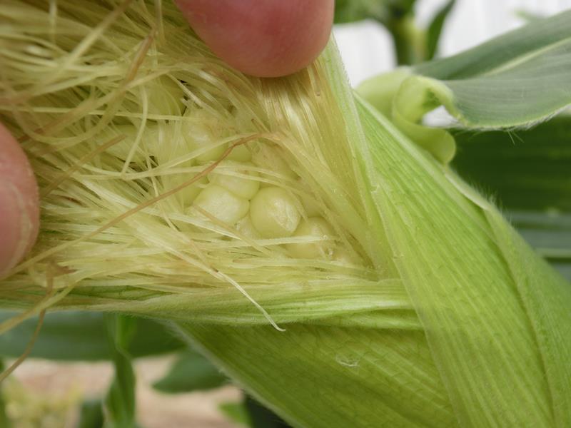 絹糸(毛)が出て20~25日後に、試しむきをし、先端の粒が膨らんで、