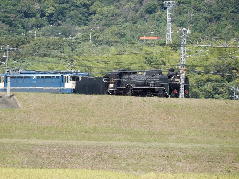 山陽本線下り方面にSLを引いた貨物列車が通過中