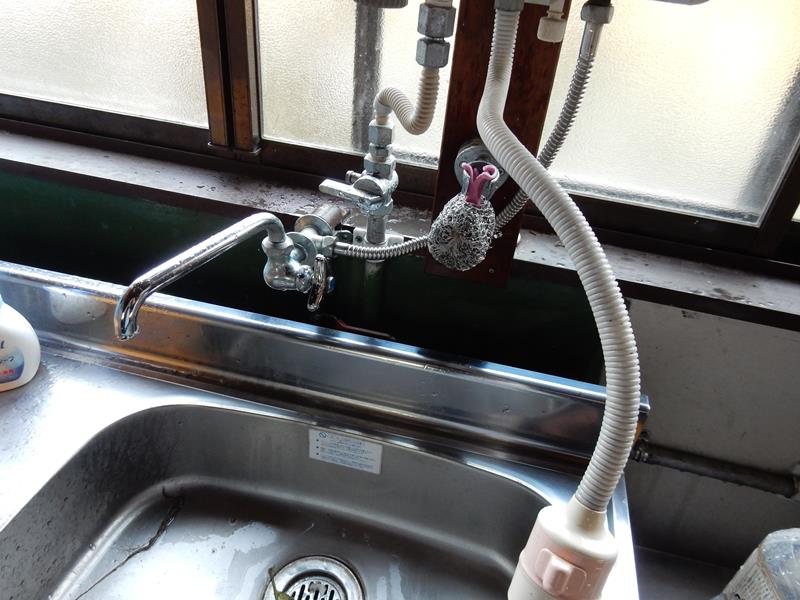 事務そばの車庫の流しから水が吹き出してる。
