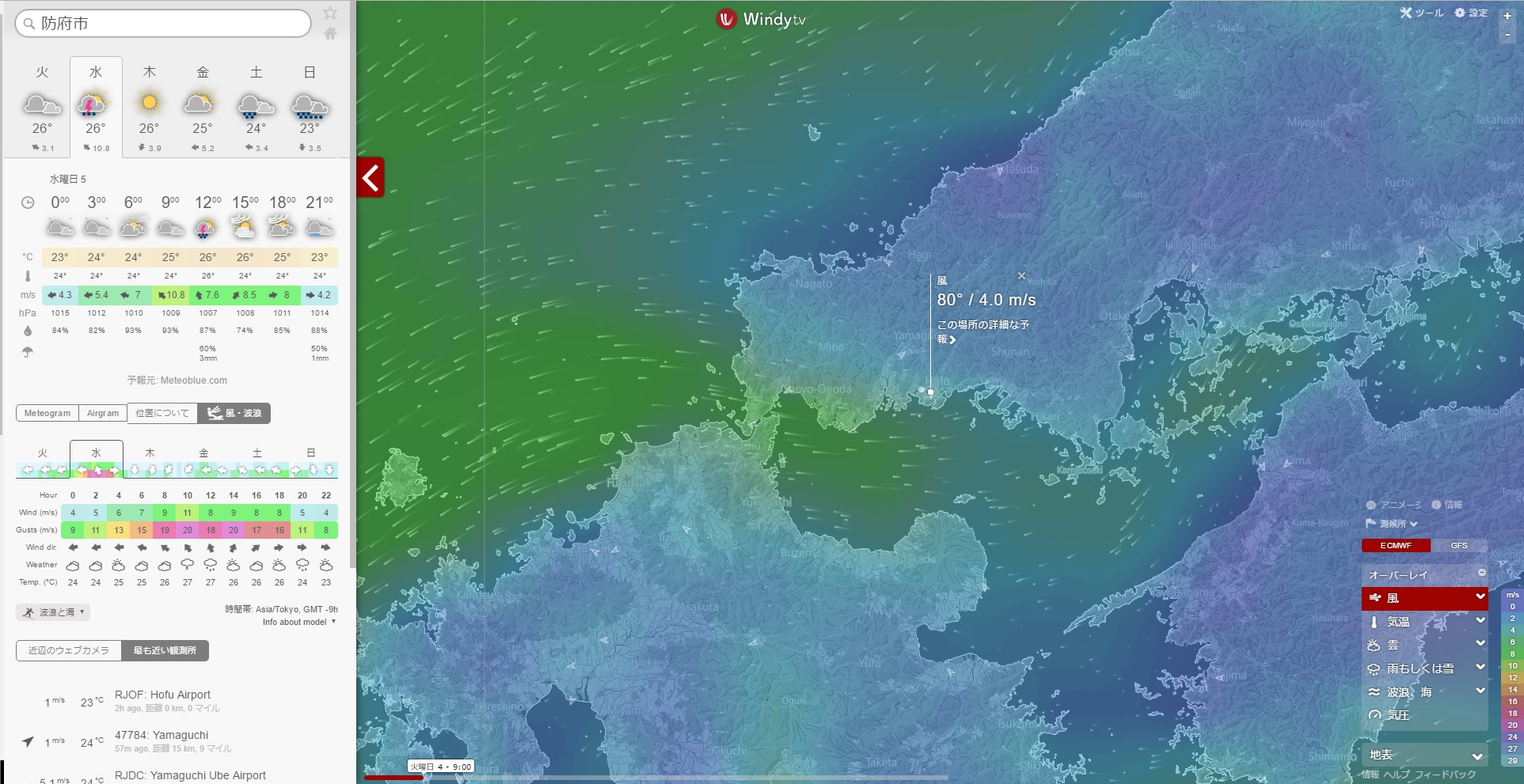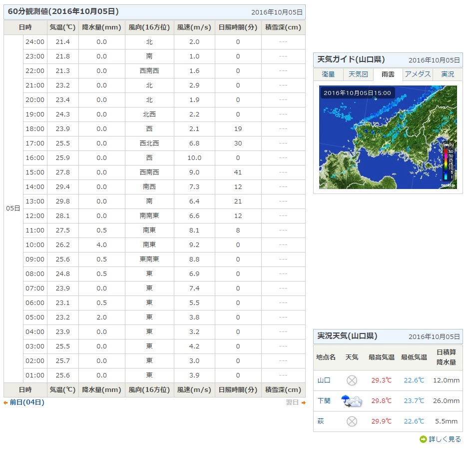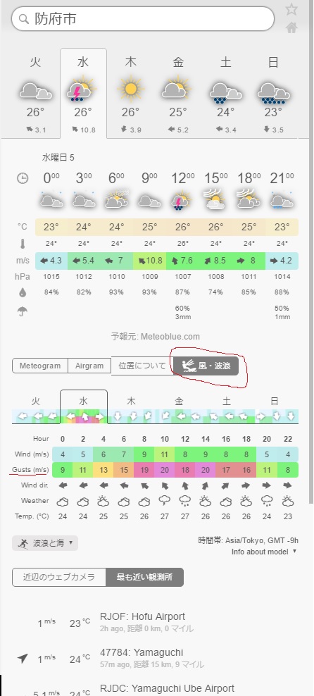 防府市は風速8~11m/s 最大瞬間風速は20m/sです。