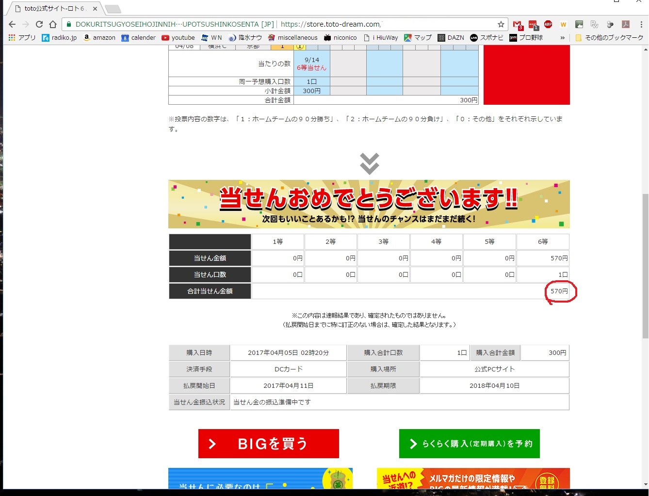 BIGの当選を知らせるメールが届く