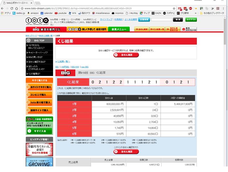 第919回BIG、totoのくじ結果をお知らせします。