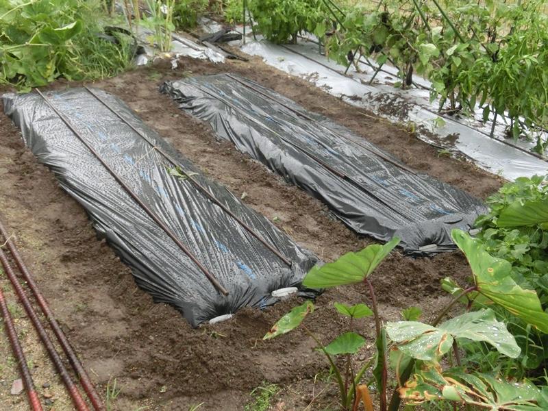 畝を立てて、マルチを張る途中、大粒の雨
