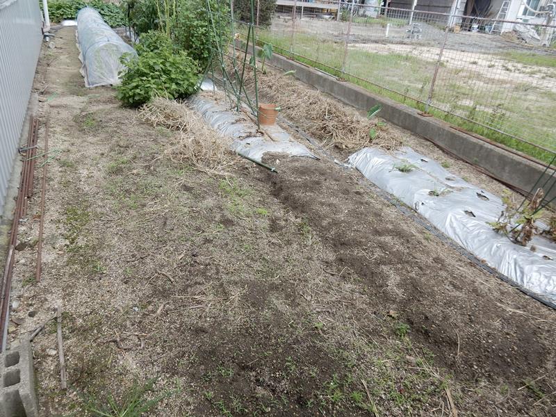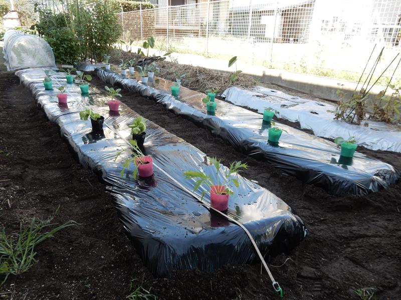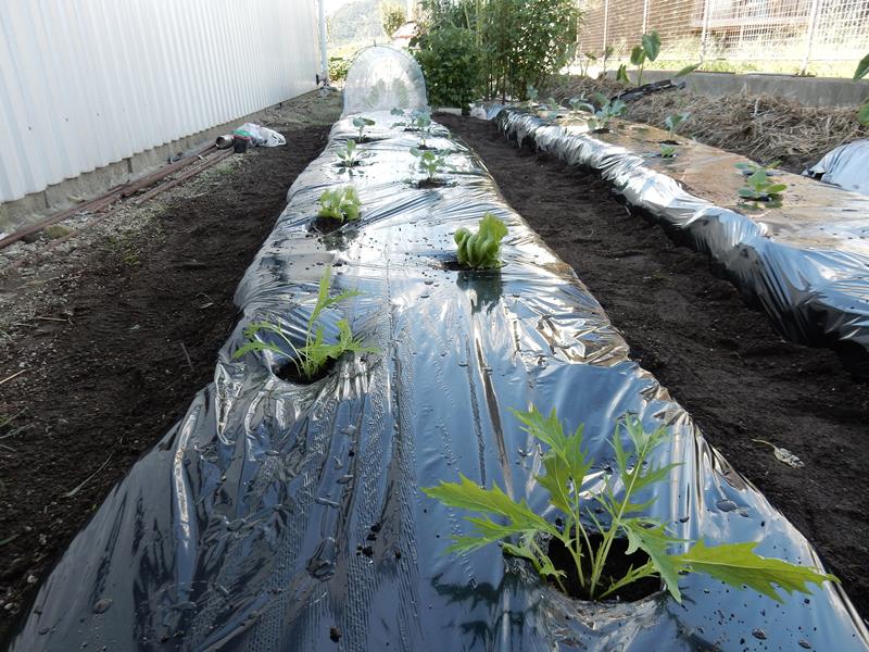 手前の畝に水菜2株 レタス2株 芽キャベツ2株 ブロッコリー3株