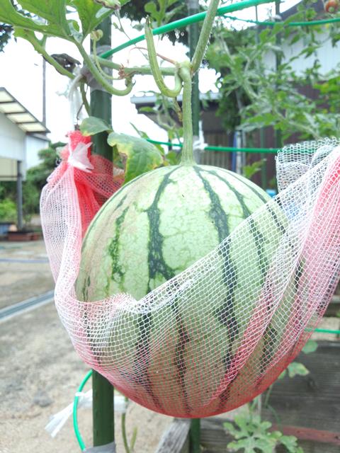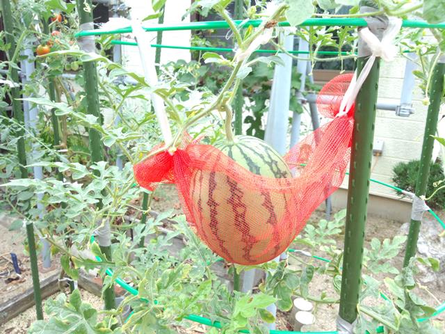 スイカがだいぶ大きくなったので、ちゃんとネットで受けました。