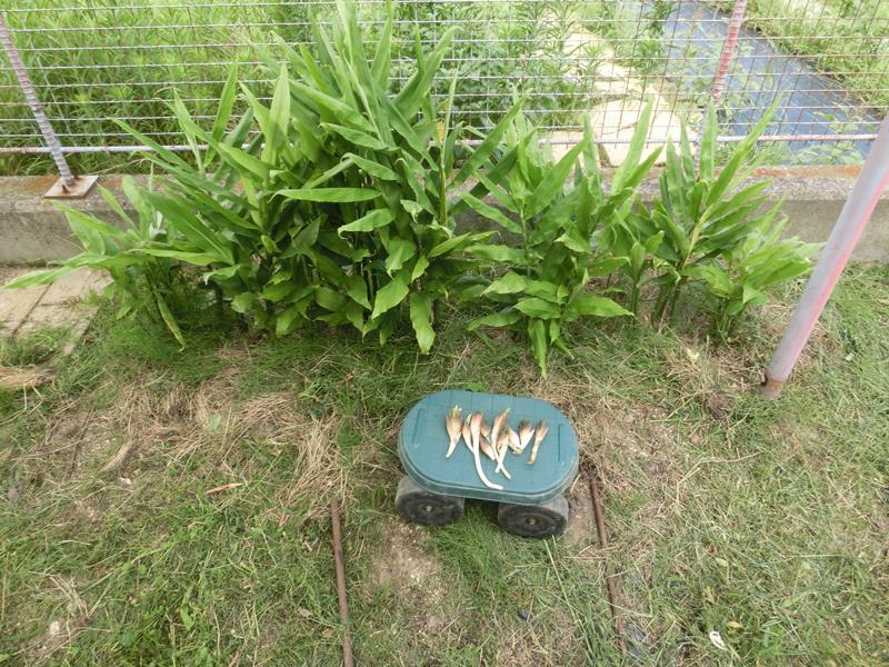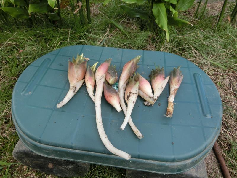 茗荷の根本を綺麗にすると、目が出ています。