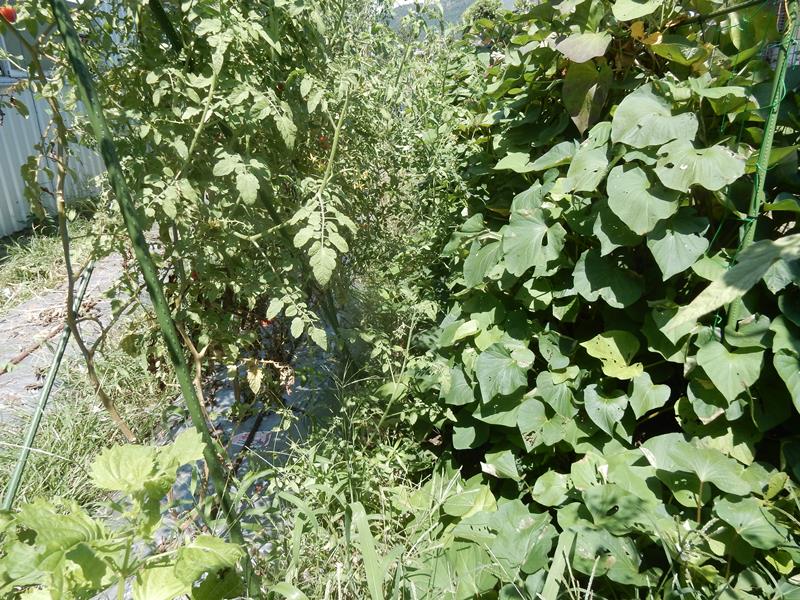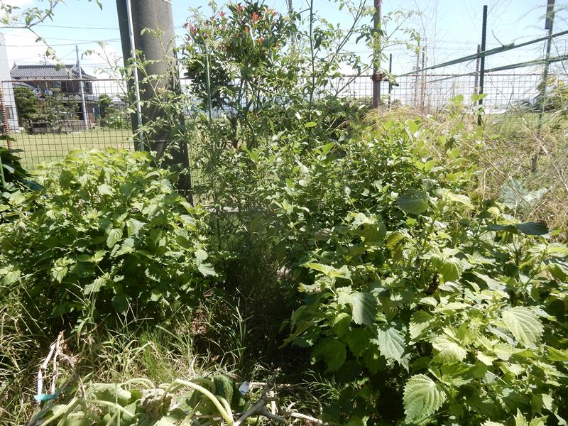 野生化した大葉 奥はトマトの脇芽を挿したのが大きくなった物