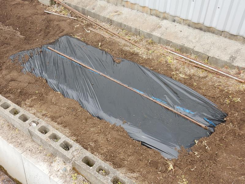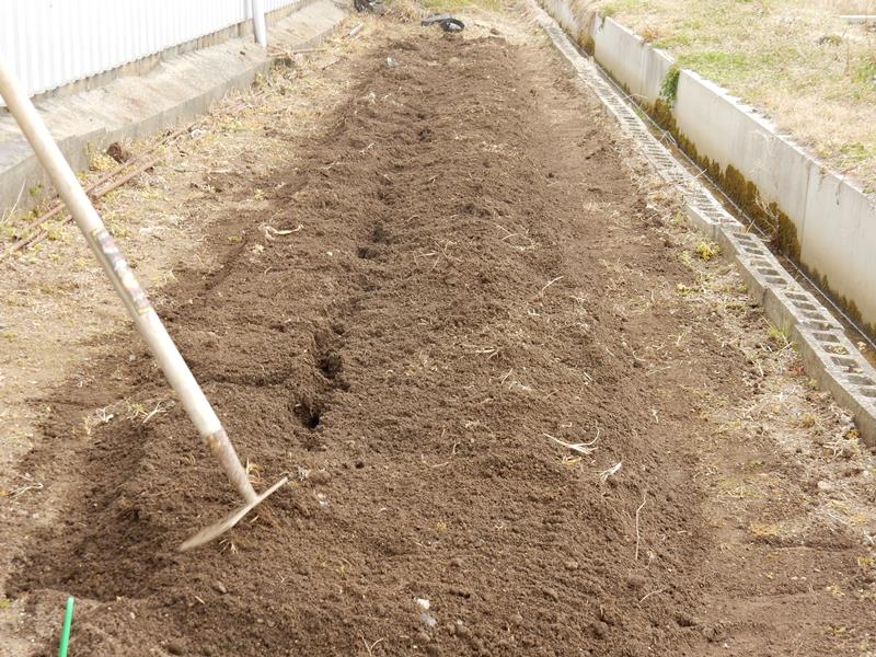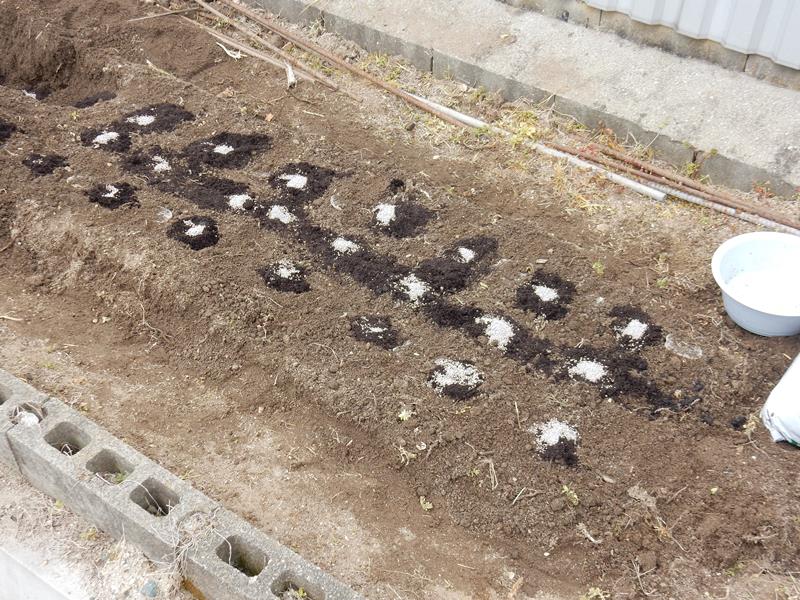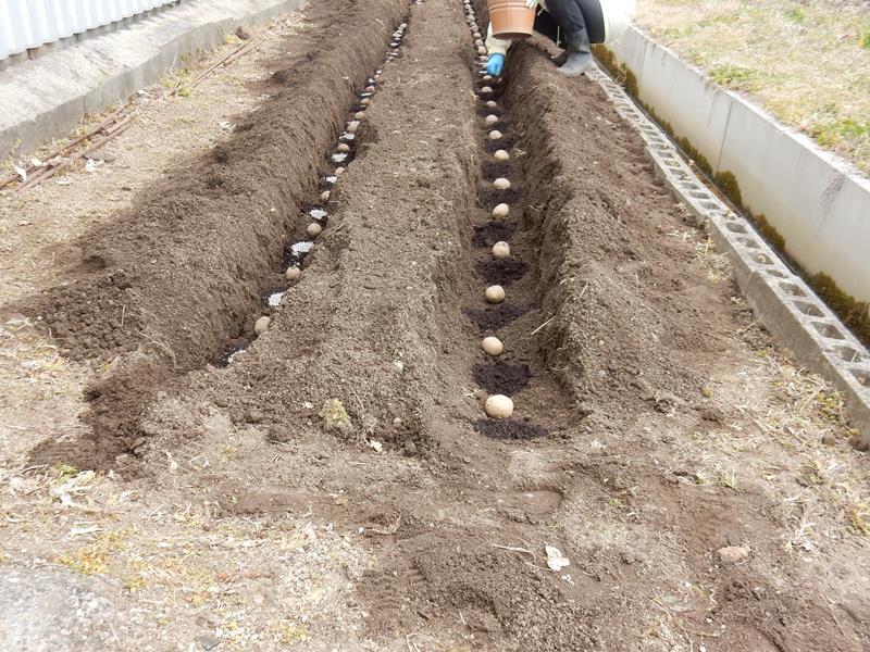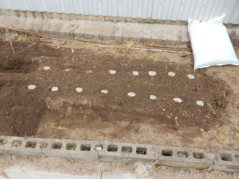 芋の間隔は30cm 中間に牛糞堆肥と芋の肥料を一握り