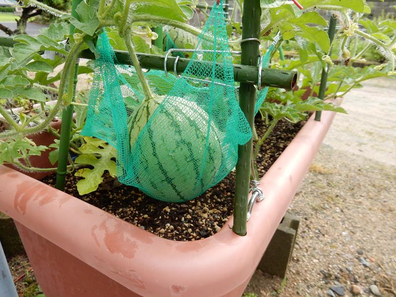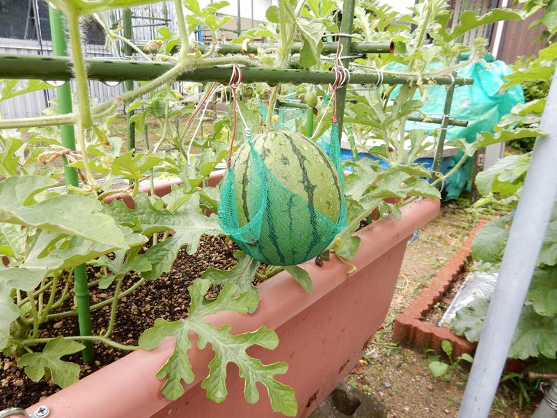 写真は弦にぶら下げて作った小玉スイカ
