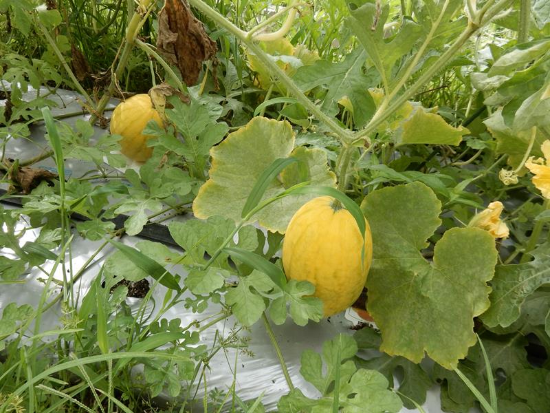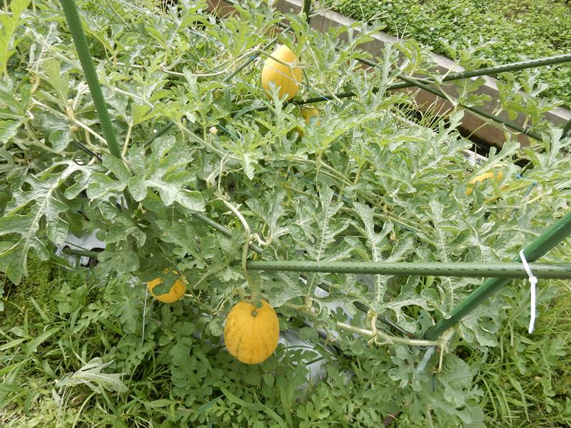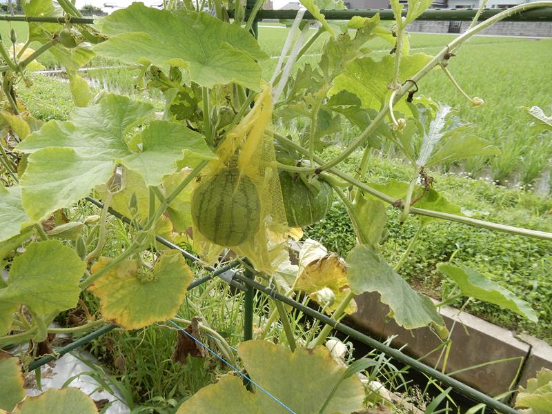 紅小玉はカラスに狙われるので黄色いネットを掛けてカモフラージュしています。