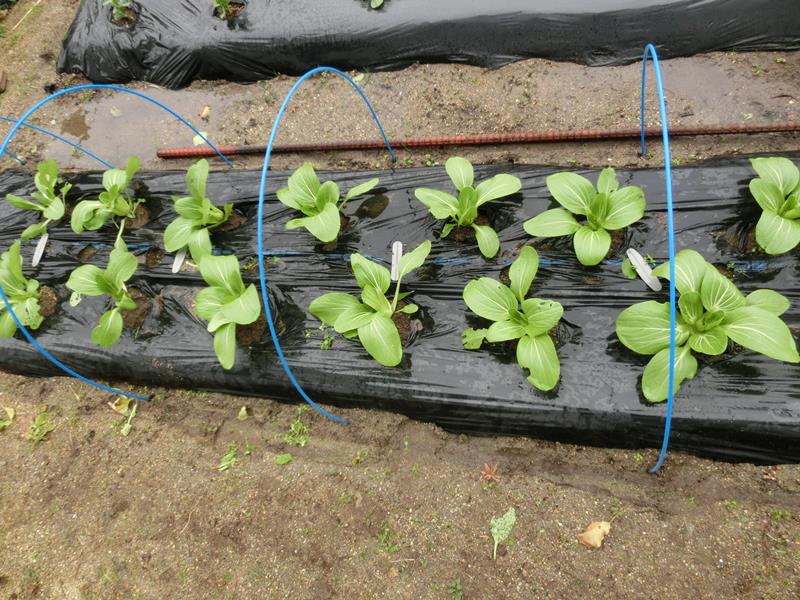 チンゲン菜の防虫ネットを外して間引きと追肥作業。