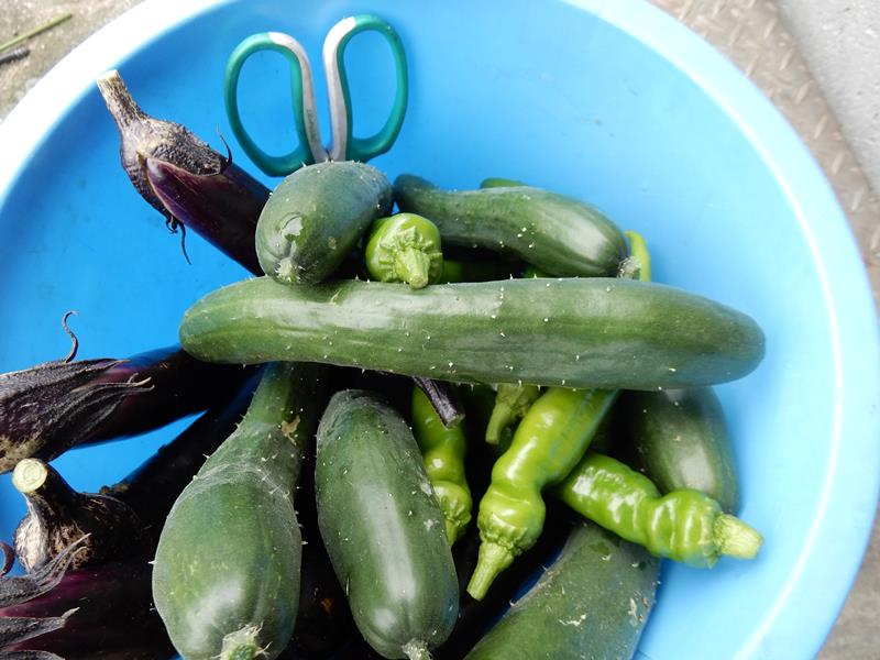ナス、きゅうり、万願寺とうがらしを収穫
