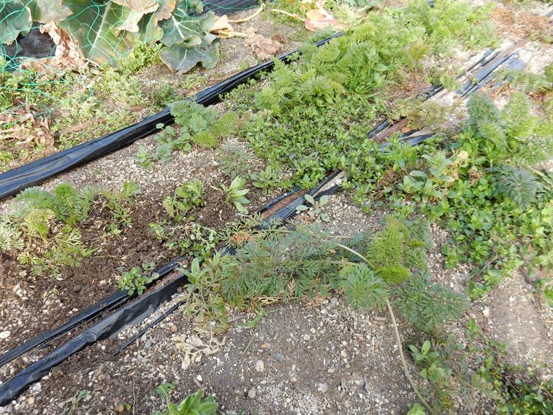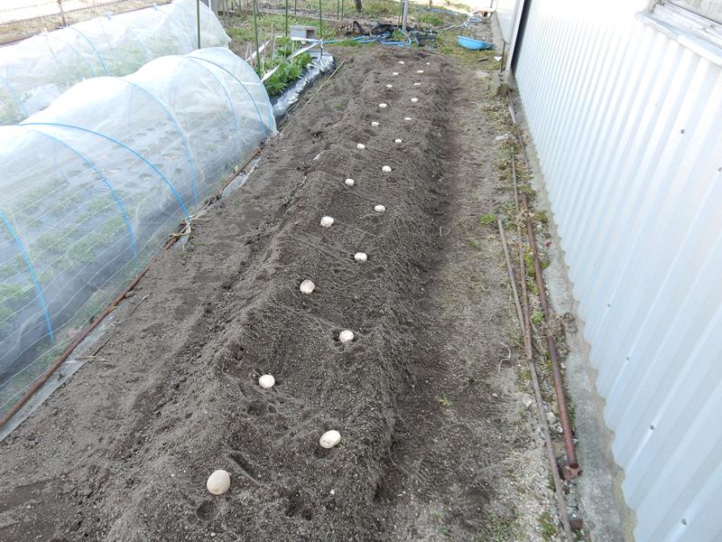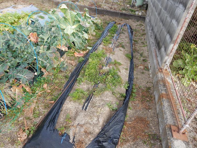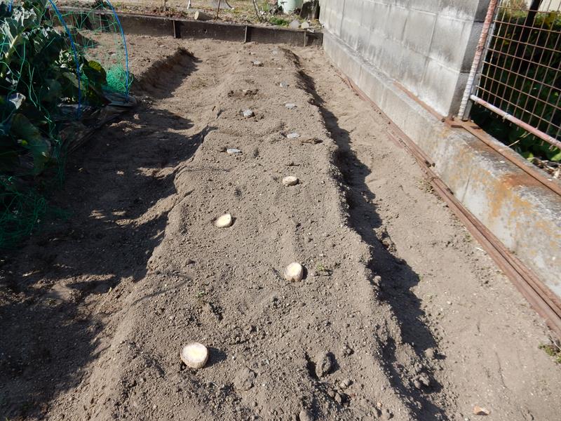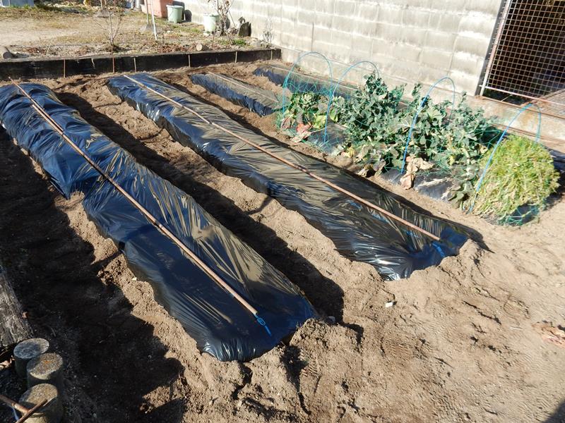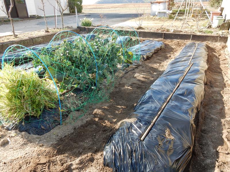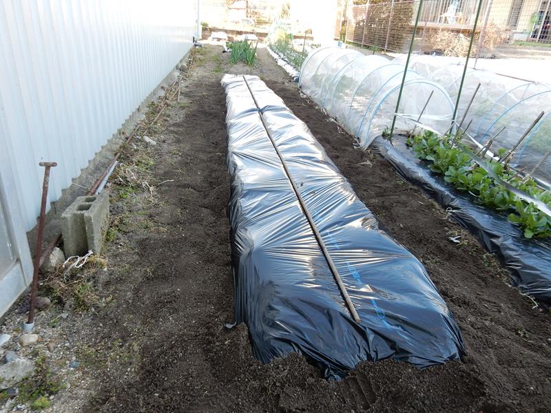 芋と芋の間に牛糞堆肥と化学肥料を入れて黒マルチを張ります。