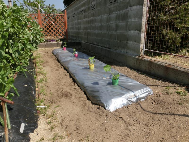 手前に オクラ4株 あと、とうもろこしとモロヘイヤのスペースです。