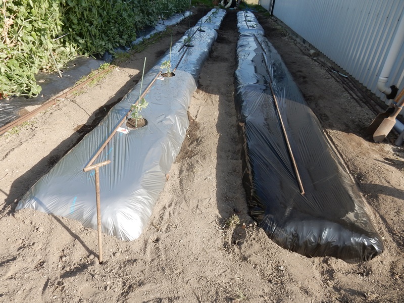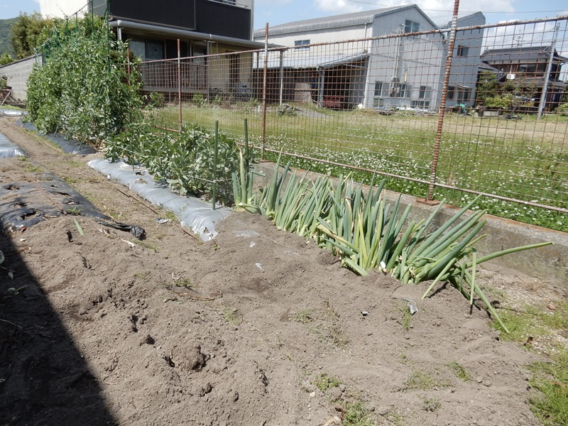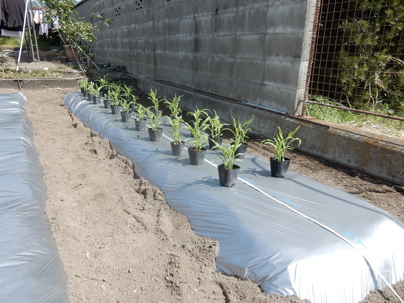 手前の黒マルチは先日植えた里芋です。