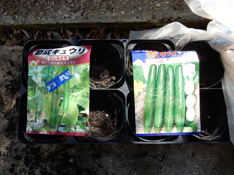種蒔きです。節成キュウリが残っていたので2種類蒔きます。