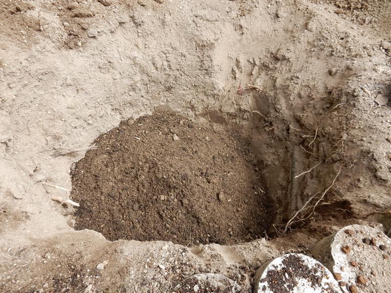 無かったので、掘った土、培養土と牛糞堆肥を混ぜ 底に油かす