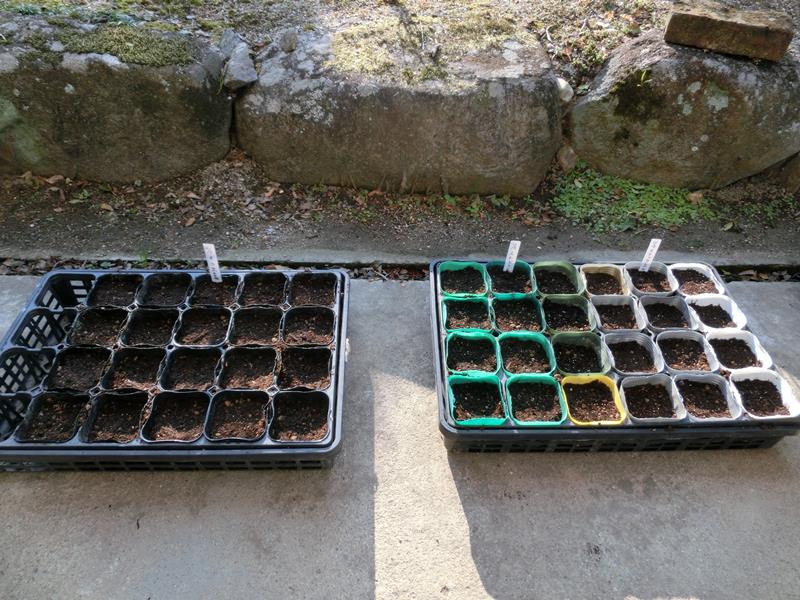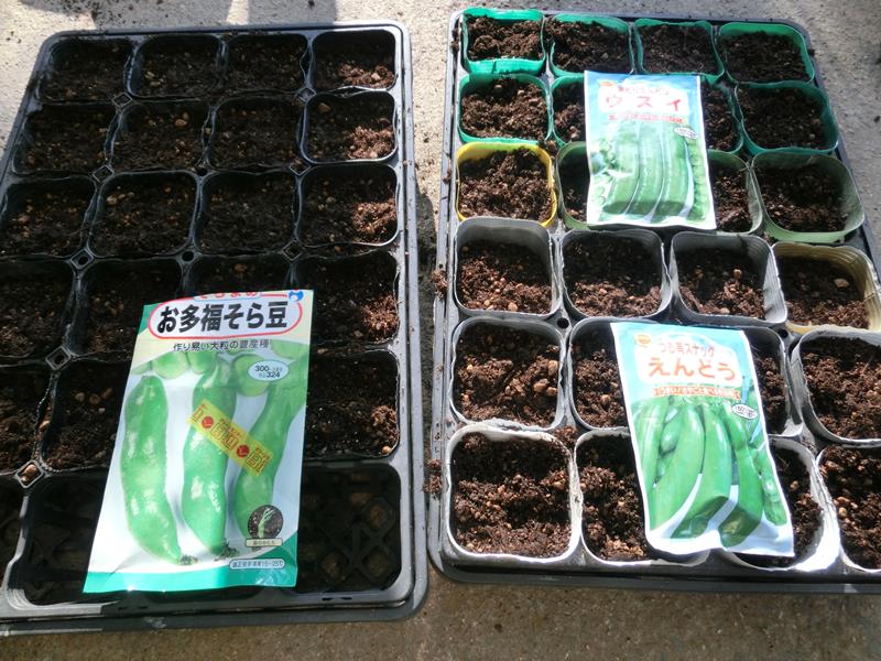 そら豆は、一粒ずつ蒔く。他は3粒ずつ。