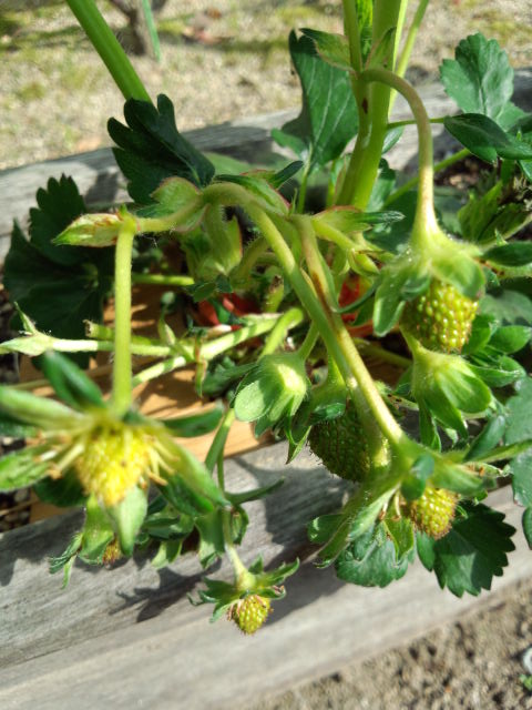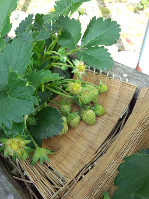 苺も小粒ながら、実が付いています。敷きワラ代わりに古いゴザを切って代用しています。