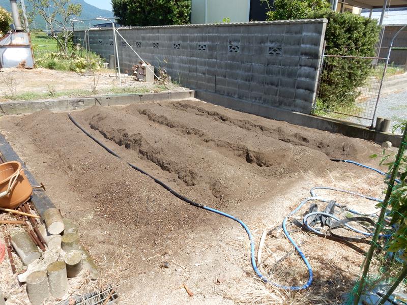 このままマルチを張ると、中がカラカラなので、しばし散水