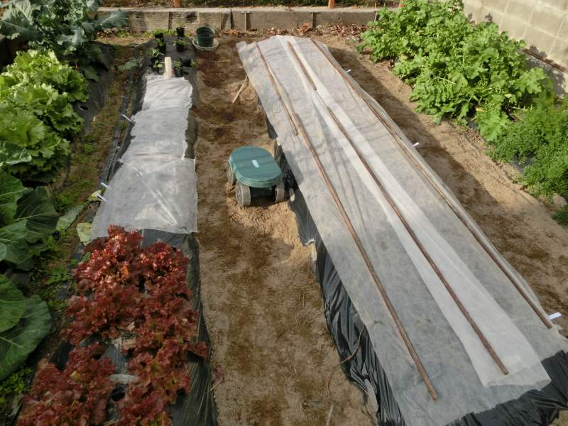 鳩やカラスに掘り起こされないように、不織布を掛けておきます。