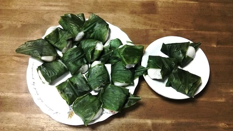 茗荷の葉で饅頭をくるんで蒸してあります。