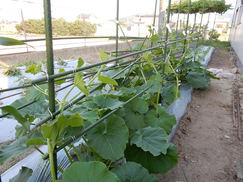 カボチャの脇芽を取って3本仕立てにして誘引