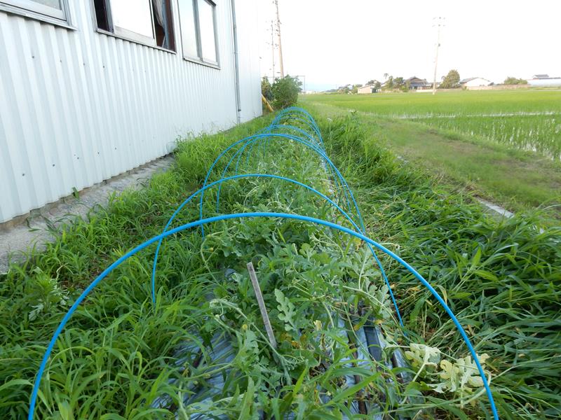 まずは畑の雑草を踏み倒し、トンネル支柱を立てる。