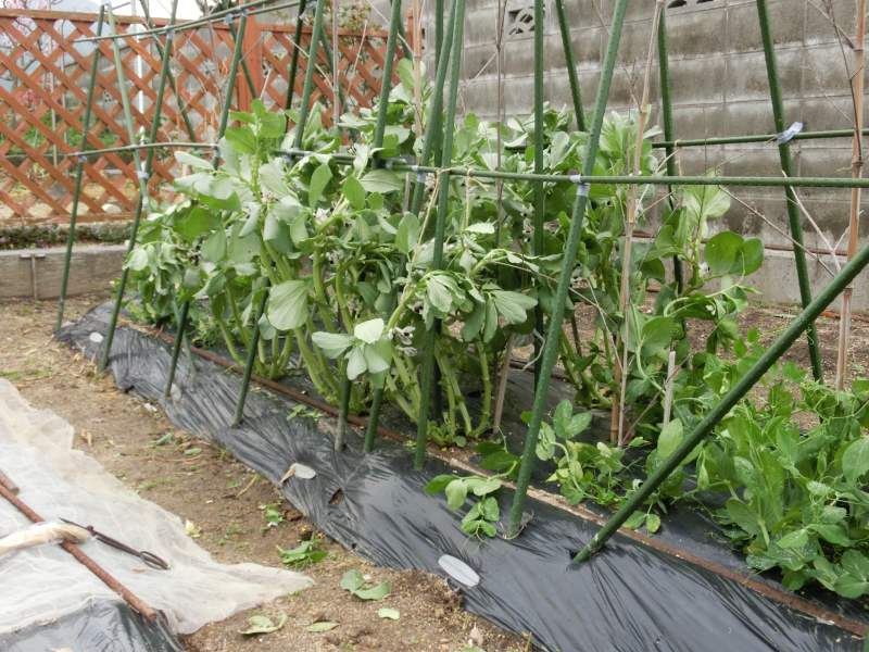 昨日の風で、空豆が倒れたので起こします。