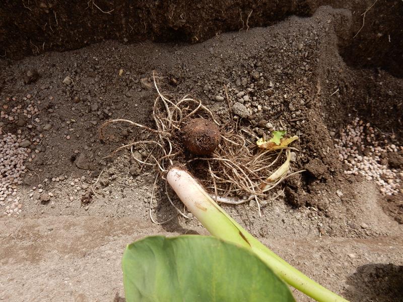 小芋の芽から伸びた茎が逆さ方向に伸びています。