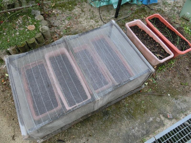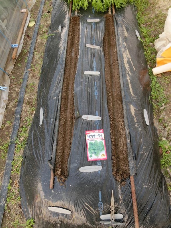 右に小松菜、左3つにチンゲンサイを蒔いています。