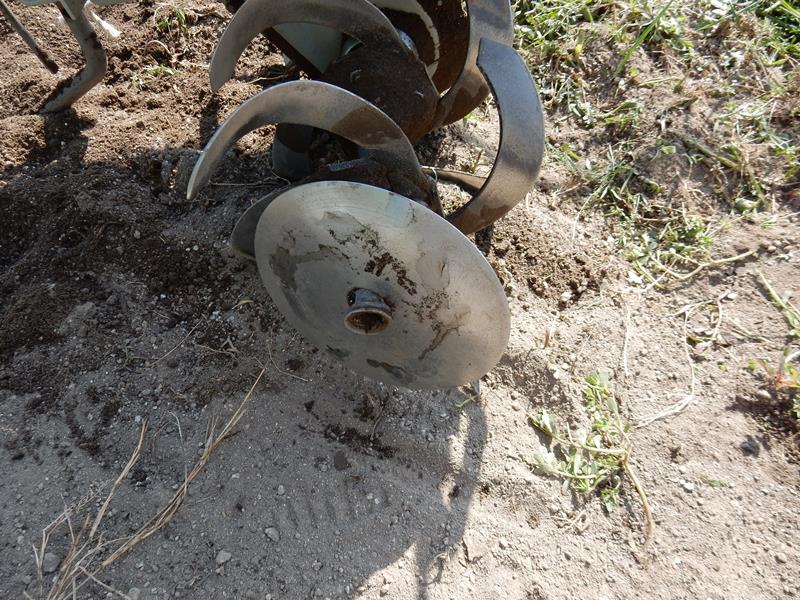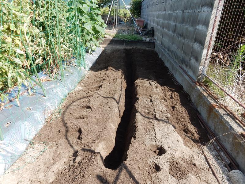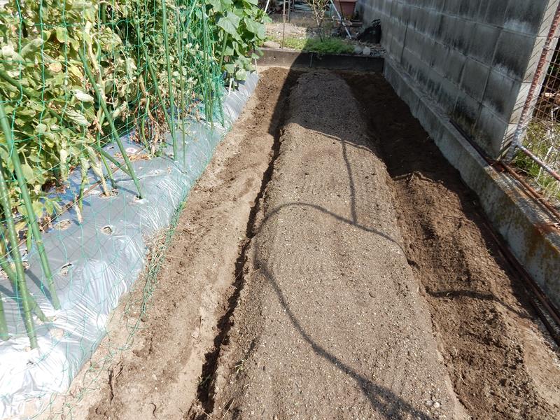 今回は、筋蒔きでなく、15cm間隔に穴を開けて