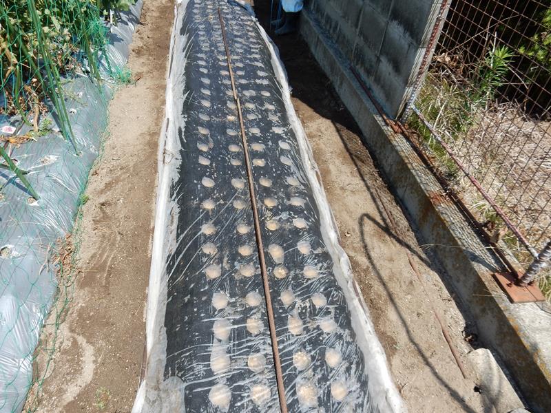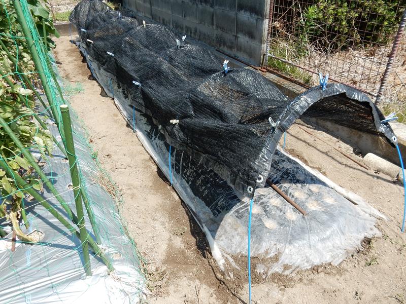 土を5ミリ程度、籾殻を入れて不織布を張ります。