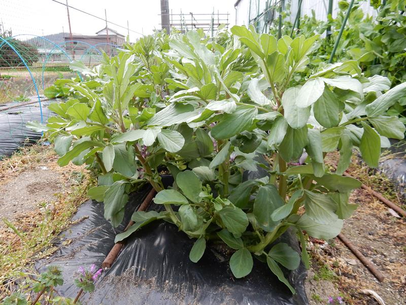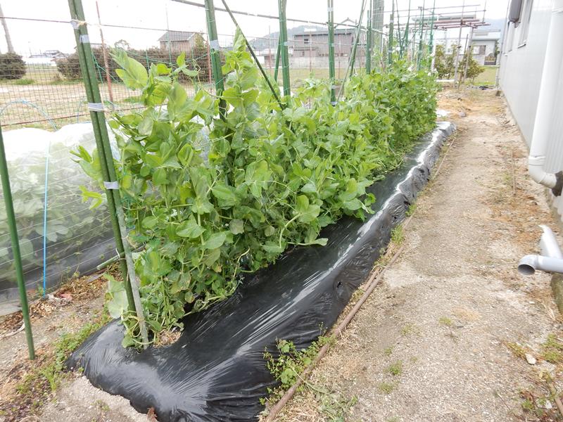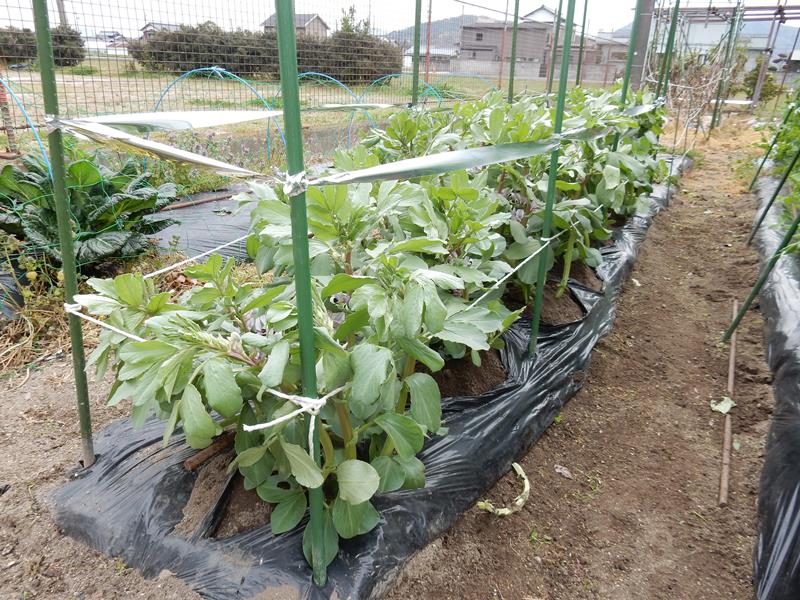 杭を立てて、アブラムシ対策に銀テープを張ります