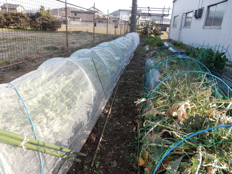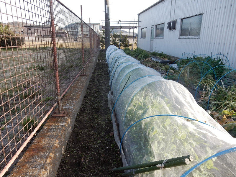 防虫網のトンネルの中はピースとエンドウです。