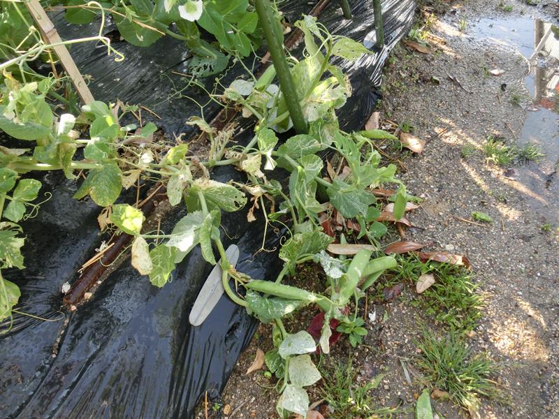 昨日の風で、空豆が倒れたので起こします。