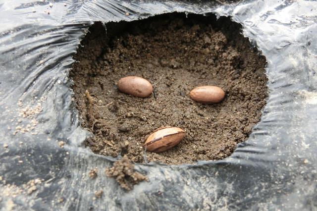 へソを下にして1箇所に3粒蒔きます。