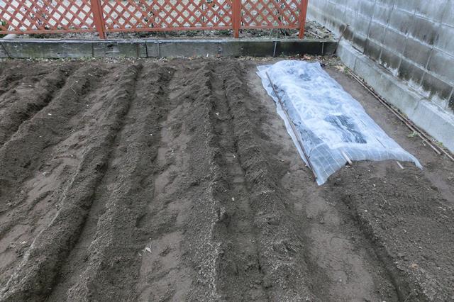 ジャガイモに土を被せて、モロッコには寒冷紗をかけておきます。