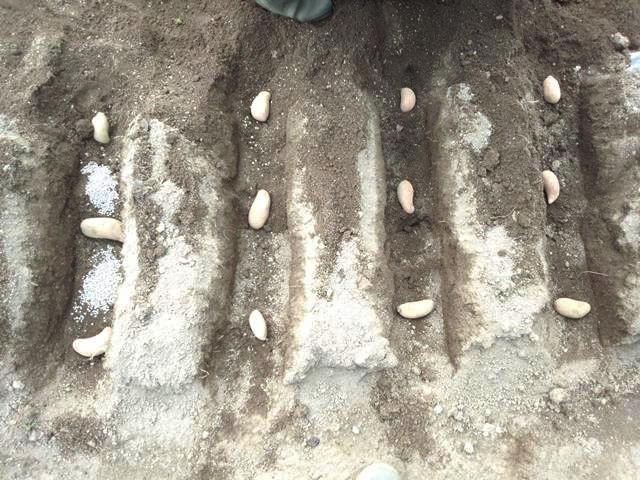 イモの間隔は30cm イモの間に肥料を1掴み。