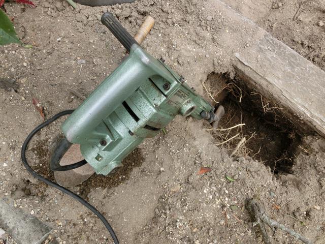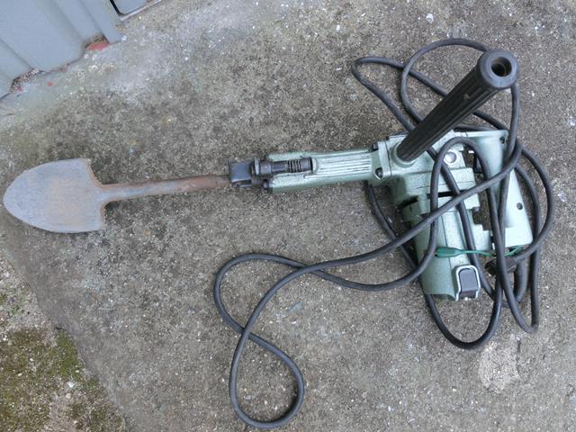ハンマードリルにスコップのアタッチメントを付けて作業。