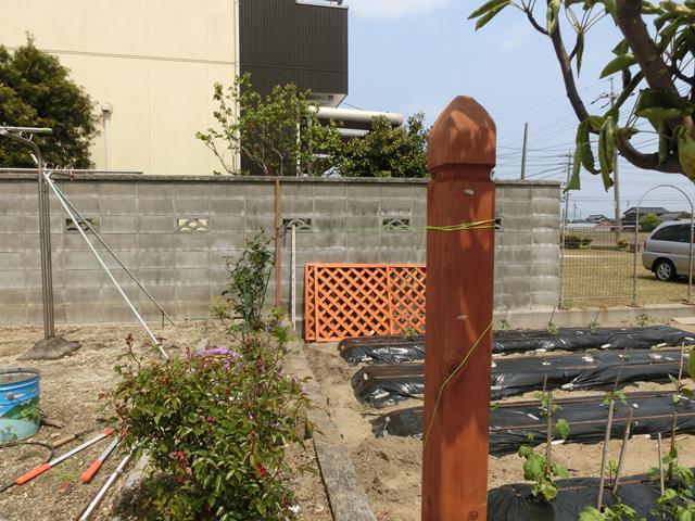 高さ水平を合わせて、柱、ラチス柵を正確に設置して行きます。