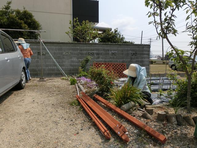 今日は、姉を援軍に呼んで作業開始。まずは花壇を整理します。