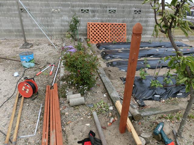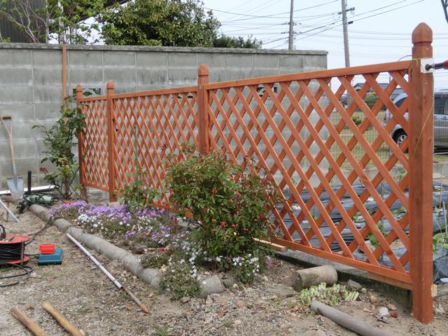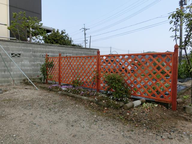 花壇と畑の間に、ナフコの特価品のラチス柵を作りました。