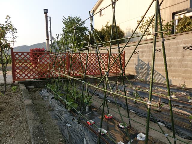 完成後にモロッコインゲンの柵。イボ竹で作ります。