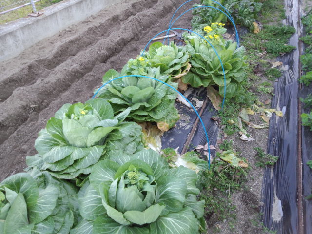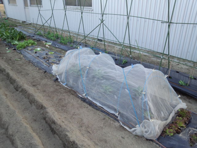 処分した白菜の横にはキャベツが4本。防虫ネットでしっかり対策済み。